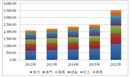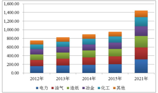 全球混凝剂和絮凝剂在工业/生产水处理应用领域保持增长。2015 年,电力、油气、造纸、冶金、化工、其他行业市场需求分别为 7.95 亿美元、4.95 亿美元、4.10 亿美元、 2.85 亿美元、 2.45 亿美元、 2.55 亿美元, 预计 2021 年分别达到 11.40亿美元、 7.15 亿美元、 5.80 亿美元、3.95 亿美元、3.40 亿美元、3.65 亿美元。