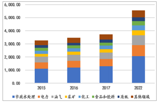我国的水处理药剂市场处于快速增长的阶段,根据数据,2017 年我国的水处理药剂市场总规模为 37.10 亿美元,到 2022 年将达到 55.49亿美元。